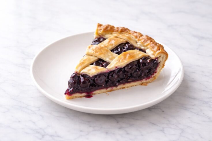 This blueberry pie features a flaky buttery crust filled with juicy blueberries, sugar, lemon, and a perfectly thickened berry filling. A classic homemade fruit pie with vibrant flavor and clean sliceable texture.