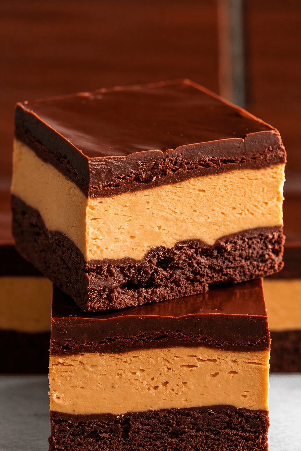Imagine this: a dense, fudgy brownie base, topped with a thick, creamy peanut butter layer that melts softly on your tongue, all finished with a smooth, glossy chocolate topping that sets into a delicate shell. Every bite gives you contrast — soft, rich, creamy, and just slightly firm on top.