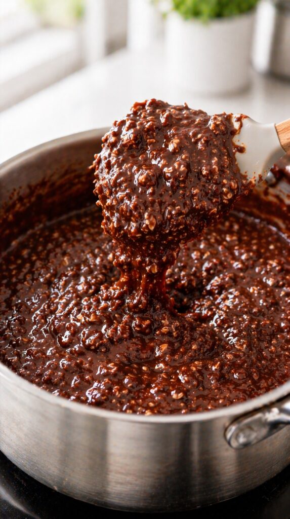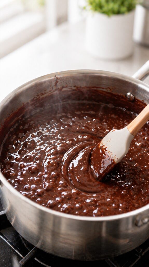 - Melt & Mix – Melt butter, then stir in sugar, cocoa, and milk until smooth.